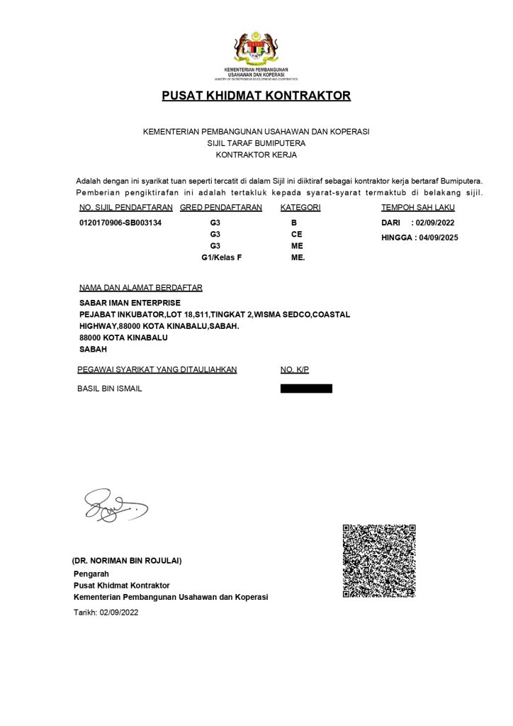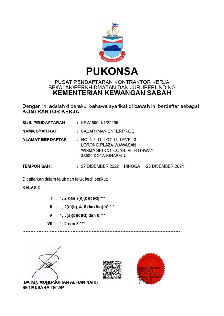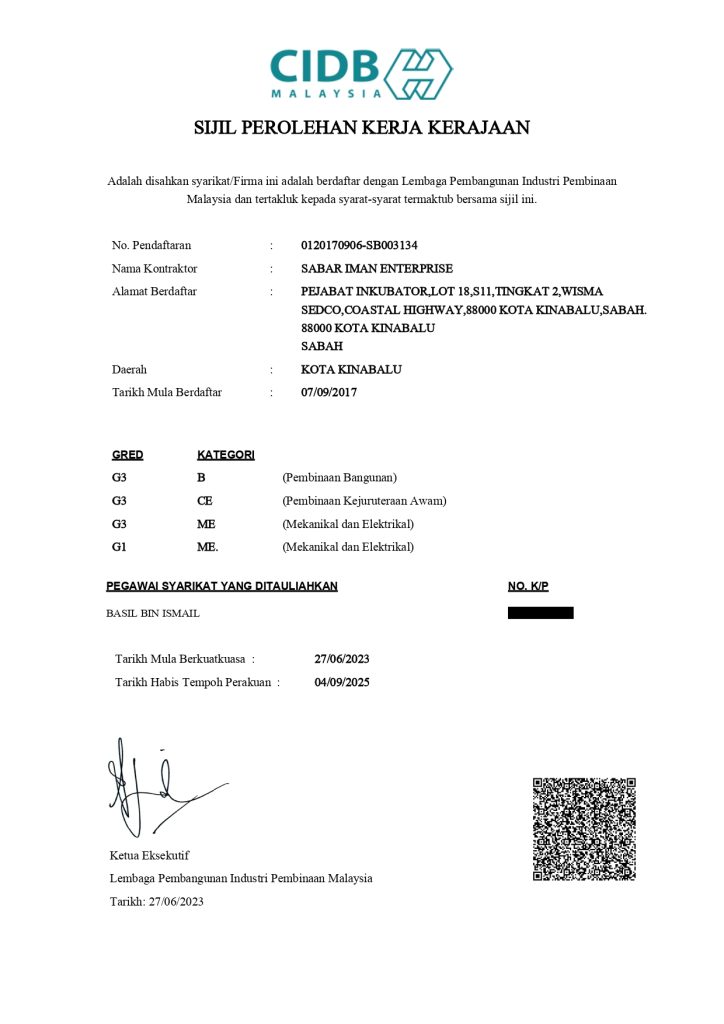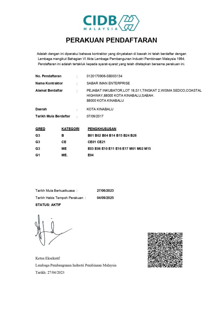 SIE telah mendapat kelulusan & perlesenan dari pelbagai pihak yang terbabit seperti CIDB, Dewan Bandaraya Kota Kinabalu, PUKONSA & lain-lain lagi supaya setiap operasi kerja yang dilakukan mengikut garis panduan & undang-undang yang telah ditetapkan.
